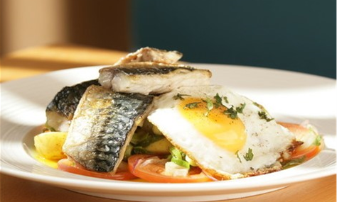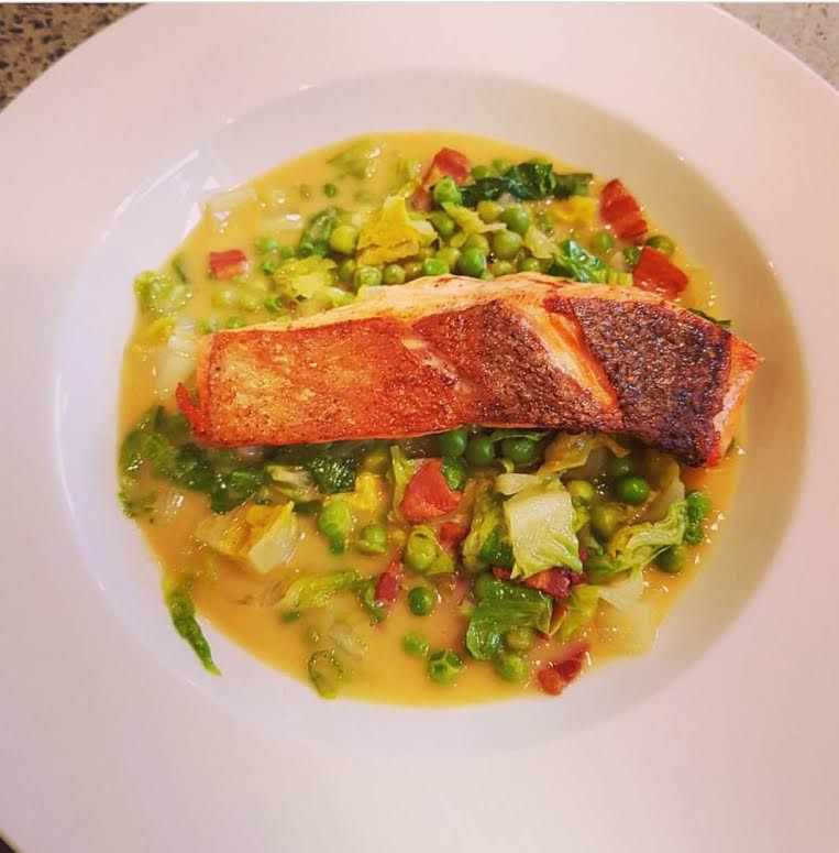 Pan roasted sea trout with sautéed peas, baby gem lettuce & a butter and horseradish sauce