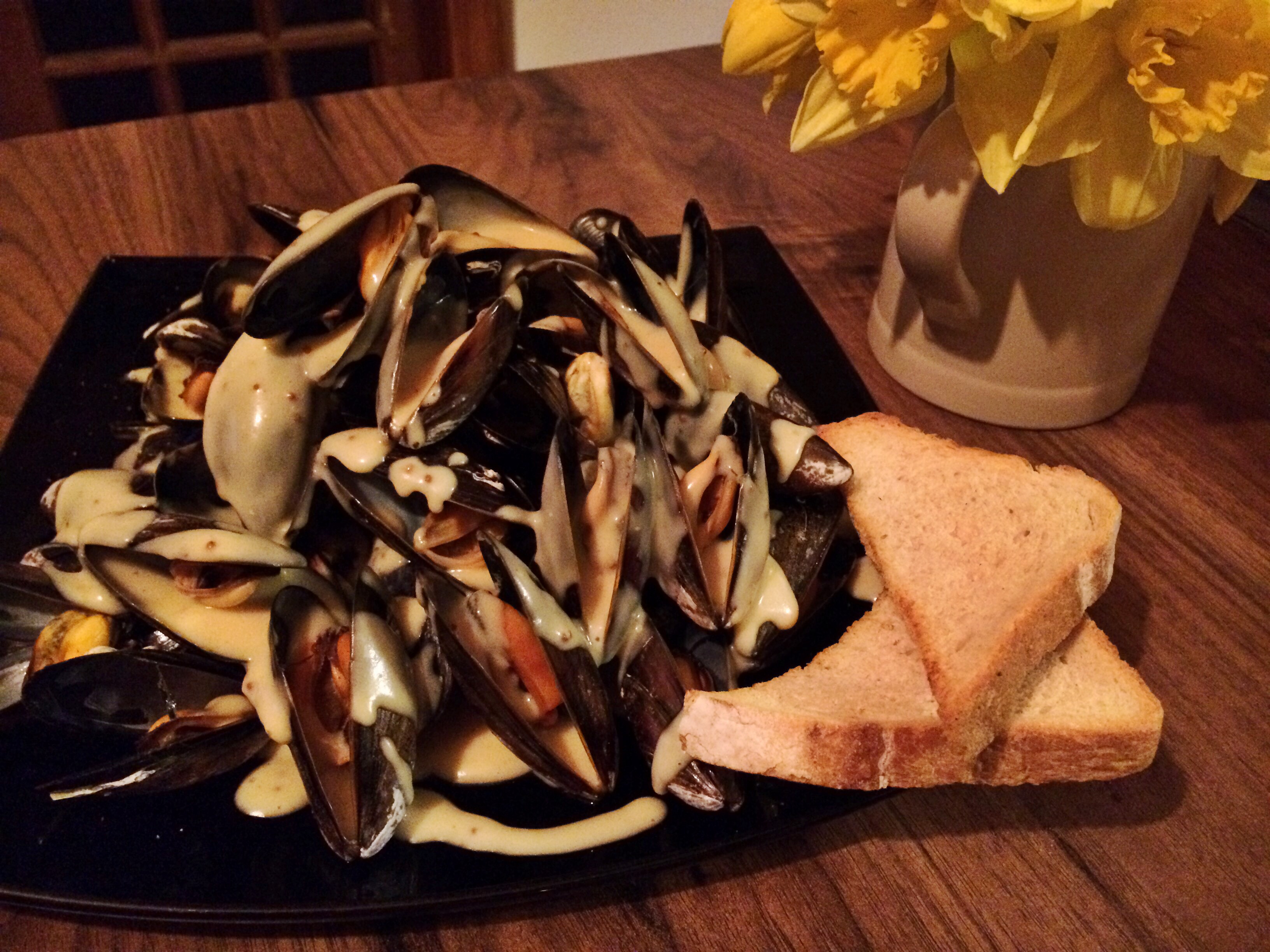 5. Arrange the mussels on a large plate or shallow bowl. Pour over the sauce (try to get as much as possible inside the shells!) and serve with lightly toasted bread.